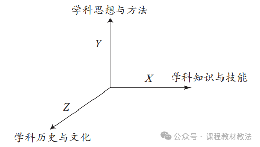 学科知识是一个三维立体结构(见图1):横向x轴是学科发展所生产出来的基础知识和基本技能(“双基”),常以“是什么”的结果性“原理课”呈现;纵向是学科思想与方法,常以“怎么做”的过程性“方法课”呈现;实践中也常把基础知识、基本技能和基本思想合称为“三基”。贯穿纵横之间的是学科历史与文化,即不同历史阶段对该学科“三基”作出巨大贡献的学科大师及相关人文故事与精神传统,常以回答“为什么”的综合性“学科史”“学科文化”等课程与资源呈现,它们既是立德树人的丰富载体,也是横向原理与纵向方法的内在统一。因此,学科精神与文化构成了学科知识体系的内核,是本体;学科原理与方法是两翼,三者共同构成了“一体两翼”立体化学科知识结构体系。这一结构在库恩(Kuhn)的学科范式理论中也得到印证:学科基础概念原理构成认知基座,学科基本思想方法形成思维框架,凝结于学科历史中的文化价值传统则塑造学术伦理与精神品格。我国学者郭元祥将其概括为“符号表征、逻辑形式和意义系统”的三维知识结构。此三维特性决定了学科教学必须实现知识掌握、思维锻造与价值引导的有机统一。掌握某门学科意味着对这一学科立体知识结构的全面理解与整体把握。