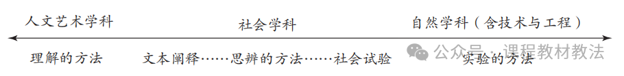 这就使得各门学科不只是系统化的抽象知识与技能的外部呈现,也是一个内含思想与方法、情感态度与价值观的学科精神与文化的历史过程,更是一个活生生的、不断发展的真善美之内在探索之旅。这意味着,学科课堂教学在传授结论性系统化知识的过程中,要将探索真善美的思想方法、情感态度与价值观予以学科知识结构的整体性还原,将抽象知识具体化、生活化和生命化。一方面,还原知识生产过程中的具体人与事,重现“是什么”“为什么”和“怎么来”的完整知识形态,开展前文所说的整体性教学设计和生命化课堂教学,回归学科知识当时生产境遇的本来面貌;另一方面,融入现实生活中的具体人与事,构建“是什么”“为什么”和“怎么用”的完整知识体系,开展生活化教学和问题性教学,活化学科知识传承与发展的本来结构。如果没有这种还原与融入,教学过程通常就成为纯结果性的知识与技能教学,而被冠以“填鸭式教学”的诟病。显然,人工智能赋能为这种还原与融入变得更为便捷。当然,不同学科因其知识生产方式不同,教学方法也呈现学科差异性。自然科学主要使用实验方法,人文艺术主要使用理解体悟方法,社会科学则介于两者之间,从而形成知识生产与传承的方法连续统一体(见图2)。在教育数字化与人工智能背景下,呈现出“科技人文化”与“人文科技化”的融合趋势,中国的“四新”教育改革和美国的“STEAM”教育就是这种融合的典型实践。